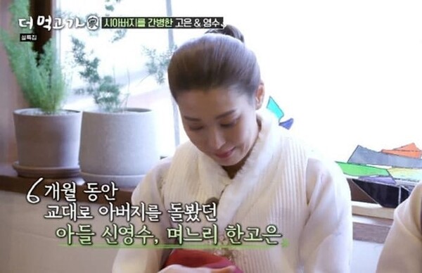 2020년, 시아버지가 투병 끝에 세상을 떠나기 전까지 한고은과 남편 신영수는 모든 일을 내려놓고 반년 동안 전적으로 간병에 헌신했다. 그는 대소변 처리와 마사지를 직접 하며 끝까지 시아버지 곁을 지켰고, 의식이 희미하던 시아버지는 한고은이 다가오면 미소를 짓곤 했다고 한다.