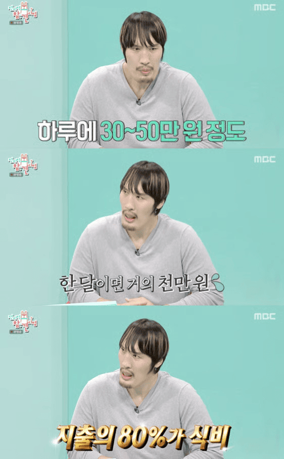최홍만은 “지출의 80%가 먹는 데 쓰인다. 하루에 30~50만 원 정도 먹는다”며 “한 달 식비만 천만 원 가까이 든다”고 털어놔 모두를 놀라게 했다.