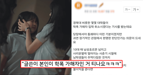 이에 대해 다수의 누리꾼들은 "글쓴이 본인이 학폭 저지른 사람인거 티난다", "다른 사람들은 사춘기 때도 학폭 하면 안 되는 거라고 배움", "사리분별은 본인이 못하는 듯"이라고 반론을 일축하며 맞섰다.