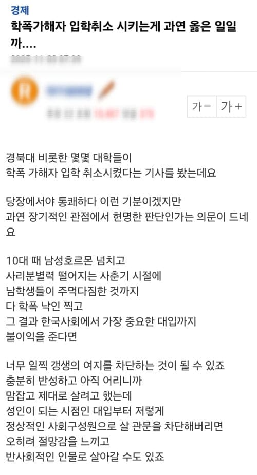작성자는 "10대 때 남성호르몬 넘치고 사리분별력 떨어지는 사춘기 시절에 남학생들이 주먹다짐한 것까지 다 학폭 낙인 찍는게 맞냐" , "당장에야 통쾌하다는 기분이 들겠지만, 장기적인 관점에서 현명한 판단인지는 의문이 든다"며 모두 학폭으로 낙인찍고 대입까지 불이익을 주는 건 갱생의 여지를 너무 일찍 차단하는 것"이라고 강하게 지적했다.