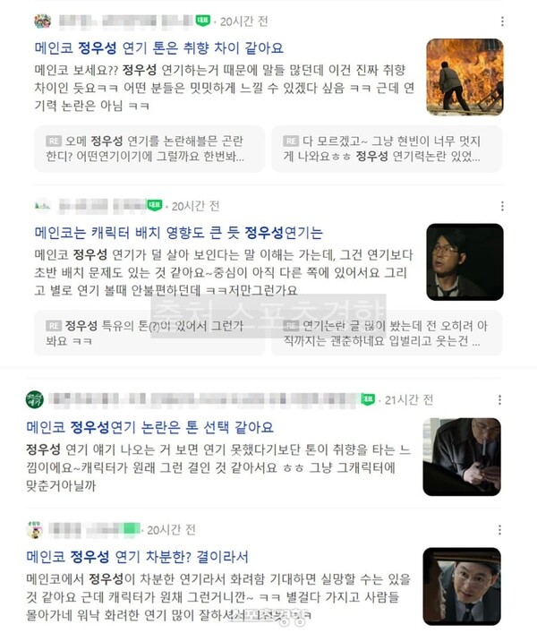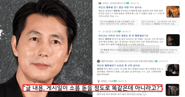 문제는 이 글들의 형식과 게시일이 모두 소름 돋을 정도로 동일하다는 점이다. 지난 13일 일제히 올라온 이 게시물들은 드라마 속 정우성의 장면 한 컷을 캡처한 뒤, 연기력 논란을 방어하는 칭찬 글 한 줄을 똑같이 적어 놓았다. 전형적이고 조잡한 바이럴 마케팅이 의심되는 대목이다.