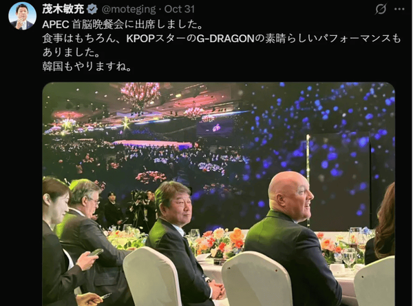 모테기 도시미쓰 일본 외무상은 31일 자신의 엑스(X·옛 트위터)에 공연을 관람 중인 자신의 사진을 올리며 "APEC 정상 만찬에 참석했다. 식사는 물론, 케이팝 스타 지드래곤의 멋진 공연도 있었다"면서 "한국도 대단하다"고 언급했다.