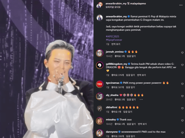 안와르 이브라힘 말레이시아 총리 역시 1일 인스타그램에 지드래곤 공연 영상을 직접 촬영해 올렸다. 그는 "말레이시아 많은 케이팝 팬들이 오늘 밤 지드래곤의 공연을 공유해달라고 요청했다. 팬들을 실망시키지 않도록 그의 공연 장면을 조금 공유한다"고 전하며, '#APEC 2025', '#Kpop Forever(케이팝 포에버)' 해시태그를 달았다. 이 영상은 하루 만에 좋아요 11만 개와 4000개가 넘는 댓글을 받았다.