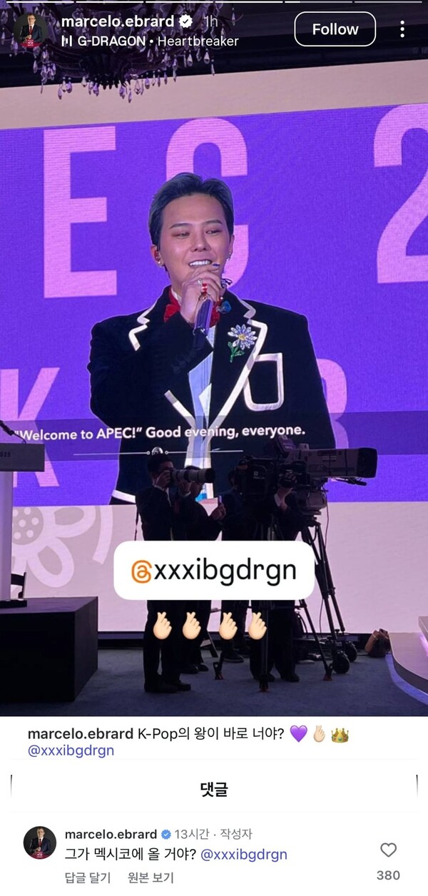 이에 팬들은 장관의 계정에 "지드래곤에게 사랑한다고 전해주세요", "지드래곤을 멕시코로 데려와 주세요" 등의 댓글로 호응했다.