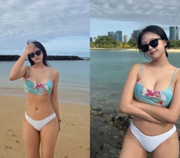 플라워 프린팅의 하늘색 상의와 하얀 하의로 구성된 비키니를 입고 여유로운 포즈를 취하는 그녀는, 18세의 나이가 믿기지 않을 정도의 글래머러스한 몸매군살이 하나도 없는 각선미확실하게 자랑했다.