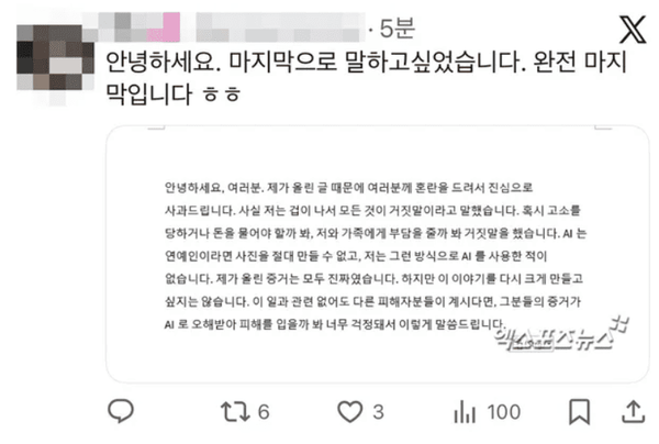 이어 A씨는 "AI는 연예인이라면 사진을 절대 만들 수 없고, 저는 그런 방식으로 AI를 사용한 적이 없습니다. 제가 올린 증거는 모두 진짜였습니다. 하지만 이야기를 다시 크게 만들고 싶지는 않습니다. 이 일과 관련 없어도 다른 피해자분들이 계시다면 그분들의 용기가 AI로 오해받아 피해 입을까 봐 너무 걱정돼서 이렇게 말씀드립니다"라는 글을 덧붙였다.