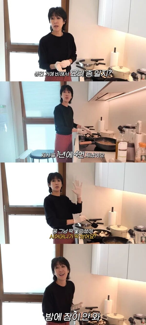 능숙한 솜씨로 잡채를 만들던 홍진경은 "나 되게 생긴 거에 비해서 요리 좀 알지 않냐"며 자부심을 드러냈다. 종갓집 며느리였다고 밝힌 그는 "제사를 1년에 4번 지냈다. 시집가자마자 그해에 제사 4개를 물려받았다. 시어머니가 딱 놓으셨다. 날 믿으신 거다. 근데 일주일 전부터 밤에 잠이 안 왔다"고 당시의 부담감을 털어놨다.