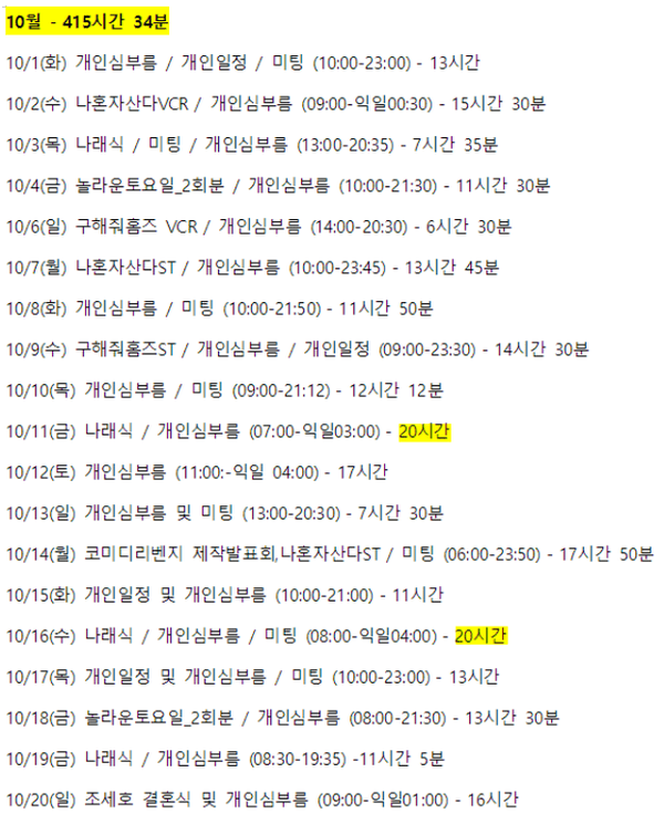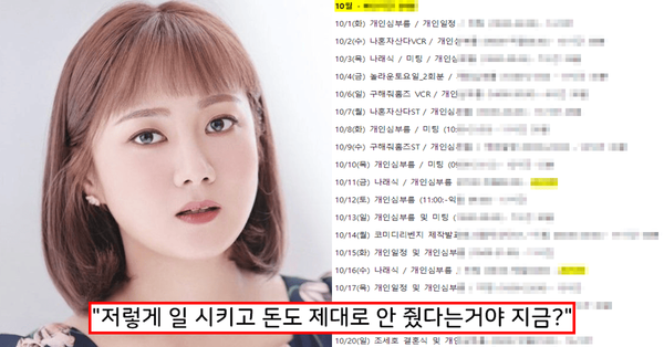 살인적인 근무 시간: 매니저들은 기본 업무 시간 외에도 박나래의 술자리 24시간 대기, 개인적인 심부름 등을 수행했으며, 파티 때마다 거의 24시간 대기, 심지어 26시간을 연속으로 일한 적도 있다고 폭로했다. 4~5명이 해야 할 업무를 여성 매니저 2명이 처리했으며, 1년 3개월간 한 달 평균 업무 시간이 400시간이 넘었다고 한다.