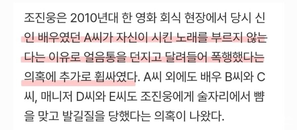 조진웅은 2010년대 한 영화 회식 현장에서 당시 신인 배우였던 A씨가 자신이 시킨 노래를 부르지 않았다는 이유로 얼음통을 던지고 달려들어 폭행했다는 의혹에 추가로 휩싸였다. A씨 외에도 배우 B씨와 C씨, 매니저 D씨와 E씨도 조진웅에게 술자리에서 뺨을 맞거나 발길질을 당했다는 의혹이 제기됐다.
