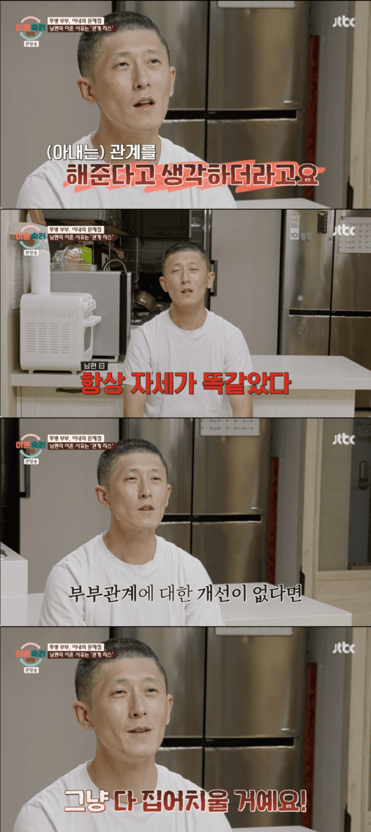 남편은 부부관계에 대한 불만을 여과 없이 쏟아냈다. 남편은 "2~3주에 한 번 하는 것도 문제인데 (아내는) 관계를 해준다고 생각하더라고요"라고 인터뷰를 통해 밝혔으며, 이어 "항상 자세가 똑같았다. 저는 그게 싫습니다. 개선이 안된다면 그냥 다 집어치울 거예요"라며 이혼에 대한 강경한 의지를 드러냈다.