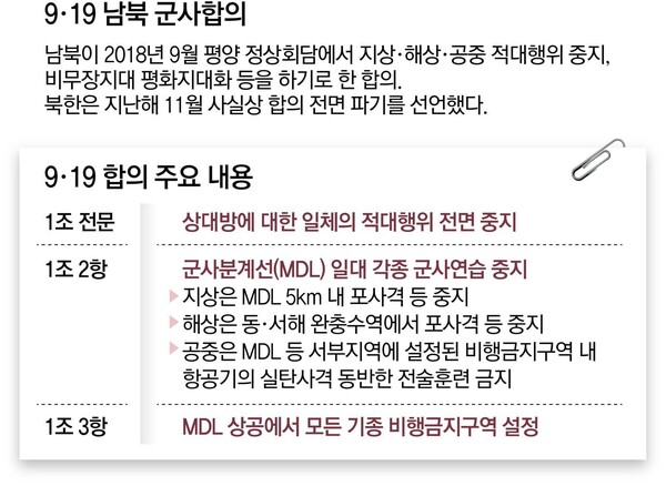 그간의 경과를 보면 9·19 합의는 북한의 도발에 의해 단계적으로 무력화되어 왔다. 지난 2023년 11월 윤석열 정부는 북한의 군사정찰위성 발사에 대응해 비행금지구역 설정 조항(1조 3항)의 효력을 정지했고, 이에 북한은 합의 파기를 선언하며 군사적 긴장을 높였다.